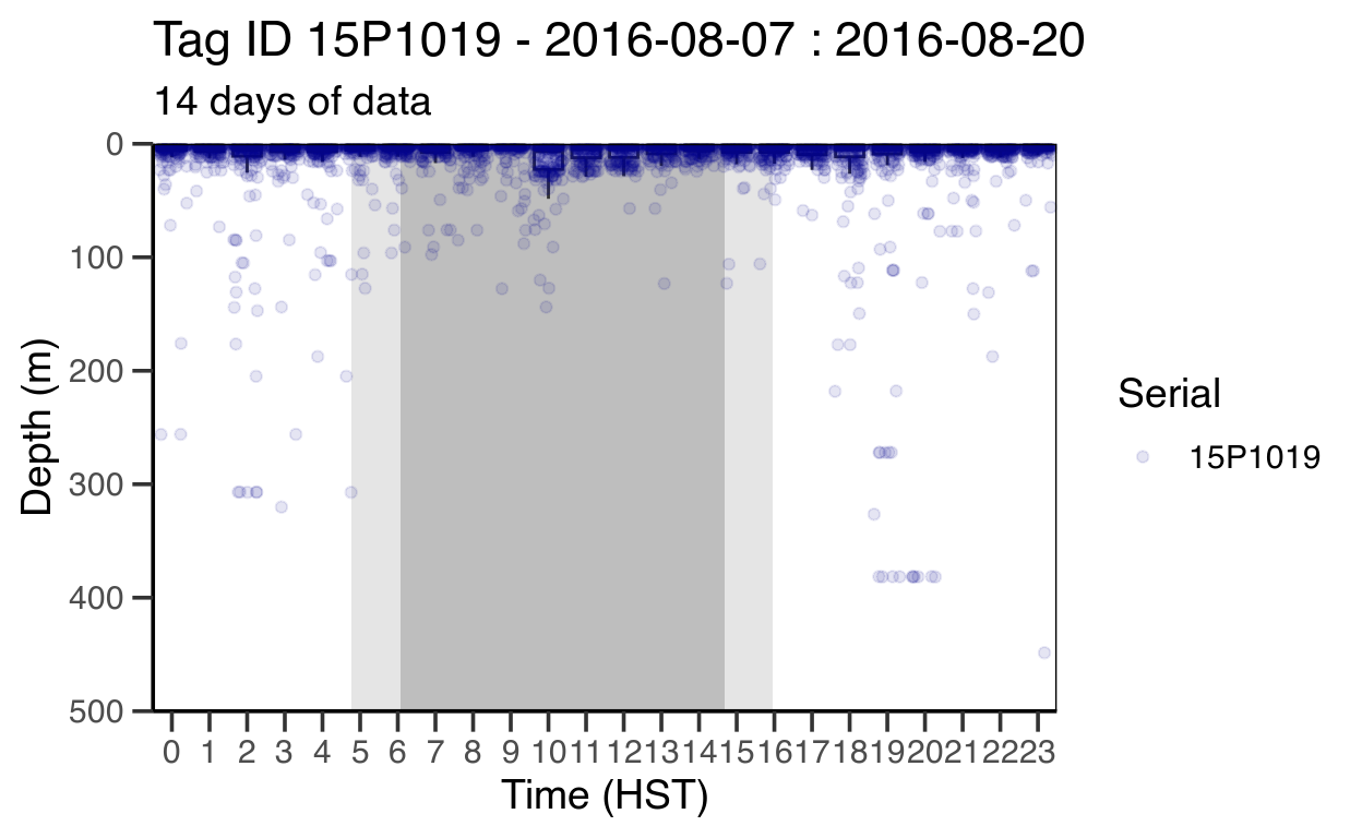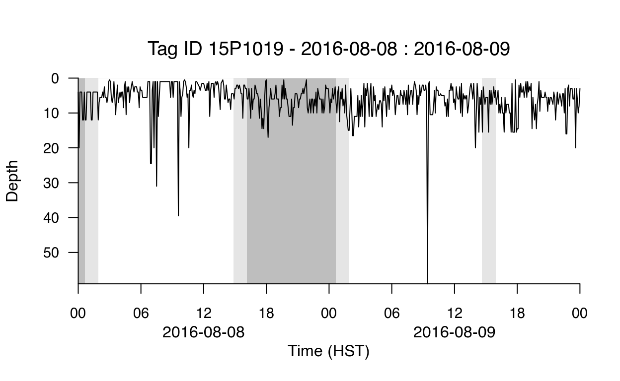 plot_DepthTS(ts_df,xlim = unique(ts_df$date)[2:3],tz = "HST",plot_DayTimePeriods=T)
