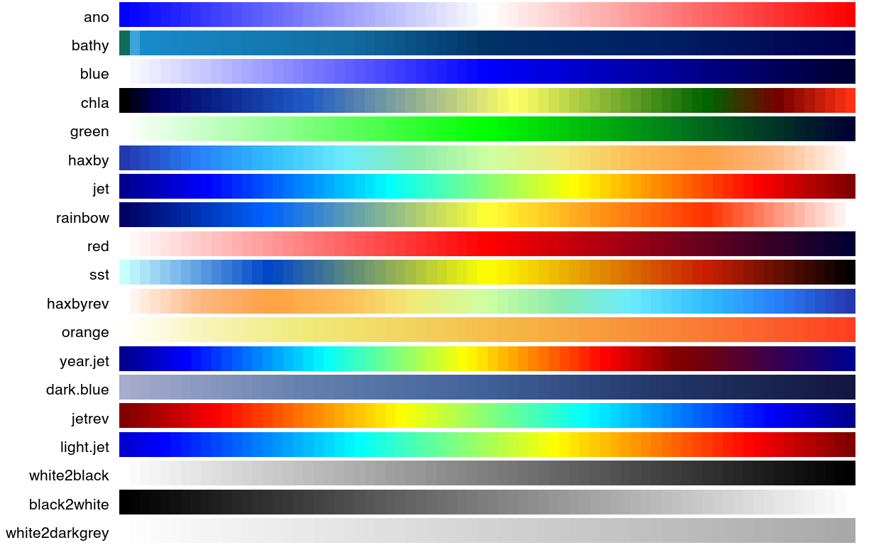 oceanmap comes with a set of pre-installed colormaps. The jet.light colormap is semitransparent and useful when visualizing overlapping data sets. The year.jet colormap starts and ends with similar colors and is therefore particularly useful when analyzing seasonal patterns in data sets. The haxby colormap is the standard colormap for bathymetry data, starting with a white color.