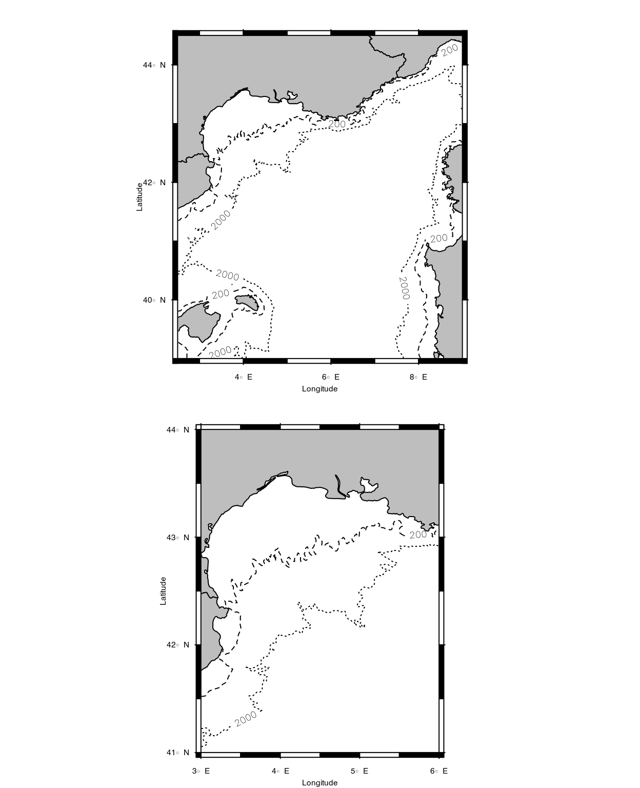v(bathy, param="bathy", terrain=F, levels=c(200 ,2000)) # show contours