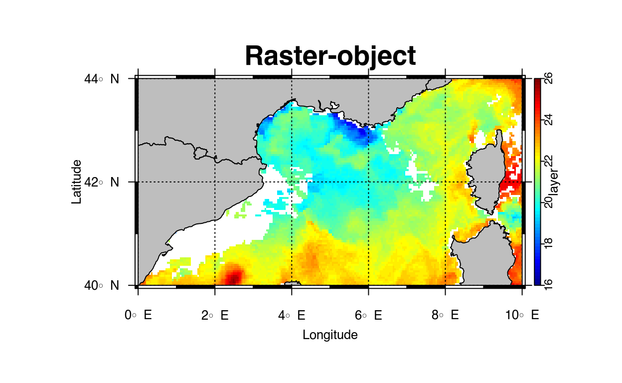 dat <- raster::crop(dat,extent(c(0,10,40,44))) ## crop data, xlim/ylim not yet implemented in v()